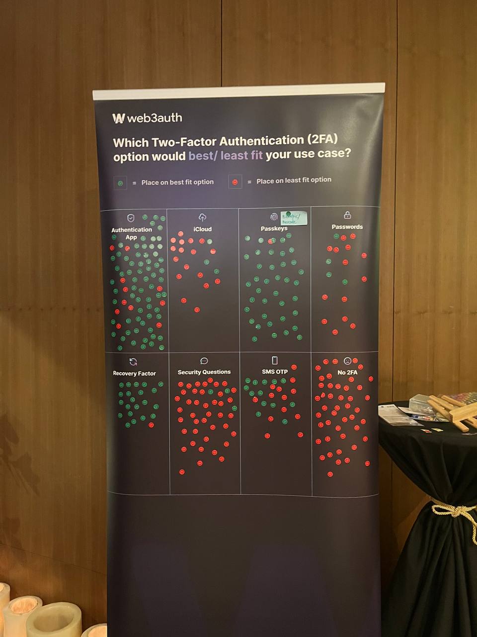 Participants are asked to vote for the best/least fit 2FA methods to their use cases. Red dot being the least fit while green dot being the best fit.